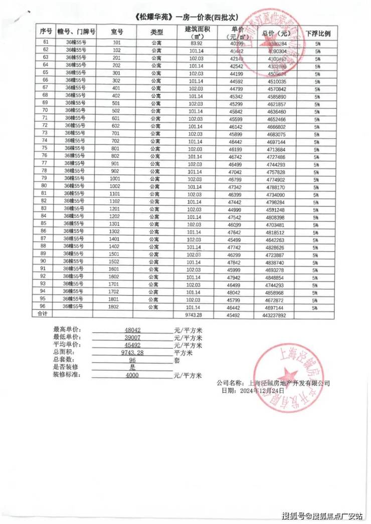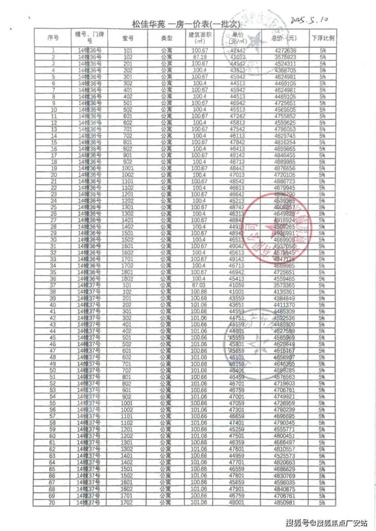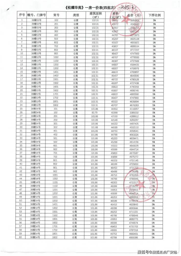 上期一房一价表如下: