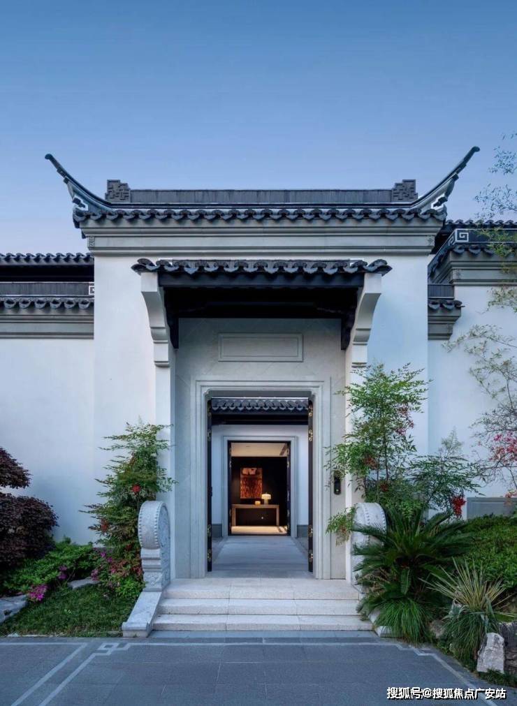 建筑风格:纯正宋式中式,白墙黛瓦、飞檐戗角、月洞门、回廊挂落,手工云纹瓦当,承袭《营造法式》,获IDA国际设计大奖