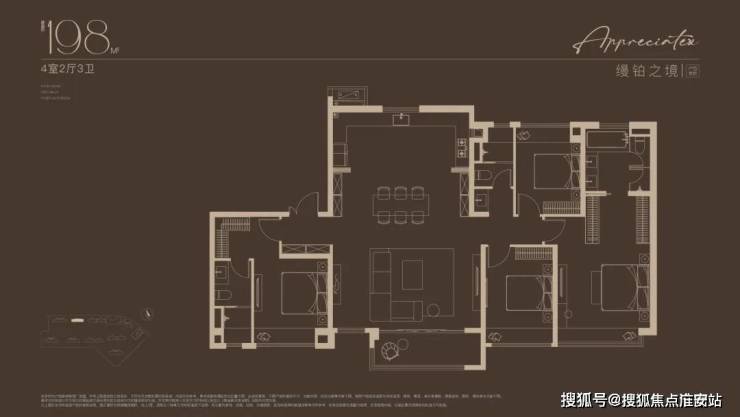 建面约172㎡4房户型,多娃家庭的进阶之选!奢阔尺度尽显家族气度!2梯2户, 子母双开门礼序入户,私密尊崇门厅;约16米四开间朝南,搭配约6米尺度横厅,揽四时风景入怀。