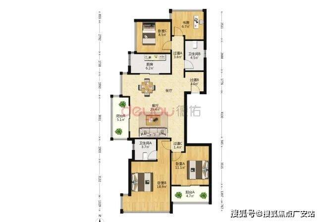 C户型89方夹边套,套内面积78.8方,3室2厅2卫,含赠送得房率89%,送5.05方。
