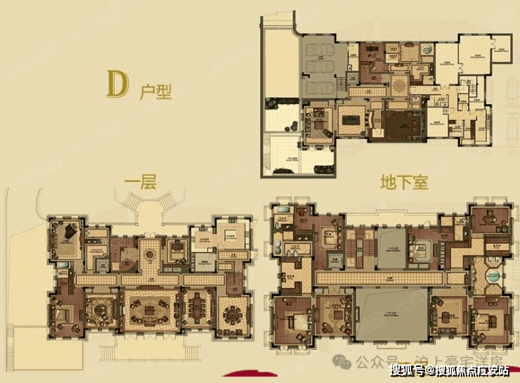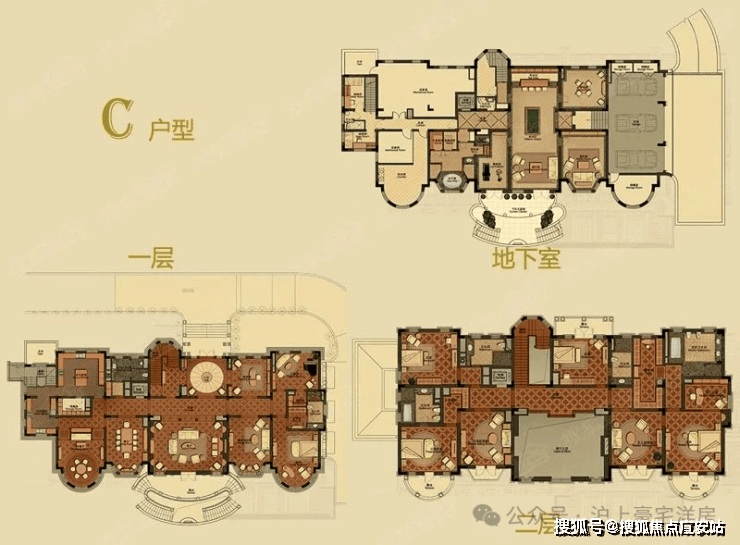 C 户型:约1300㎡(地上 2 层 + 阁楼 + 地下 1 层),6 室 4 厅 8 卫,花园约 2200㎡
