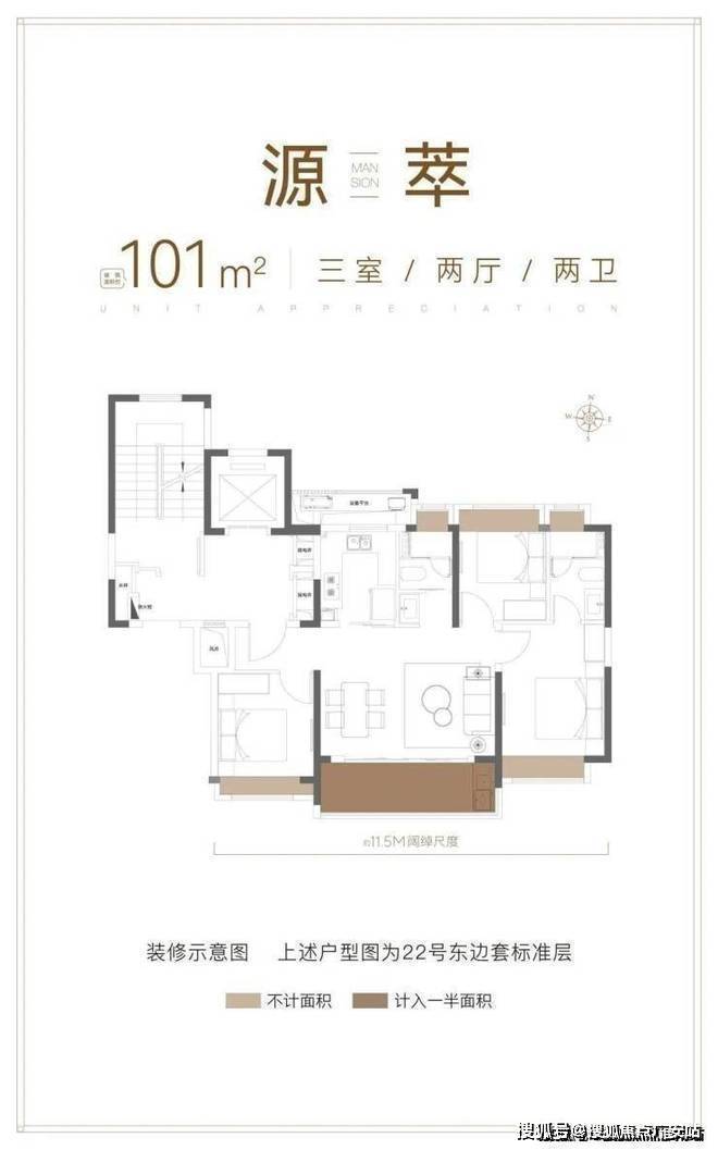 建面约101㎡3房2卫户型,非常标准的飞机户型。三开间朝南整体约11.5米的面宽,客厅面宽更是做到了约5.3米的舒阔尺度!