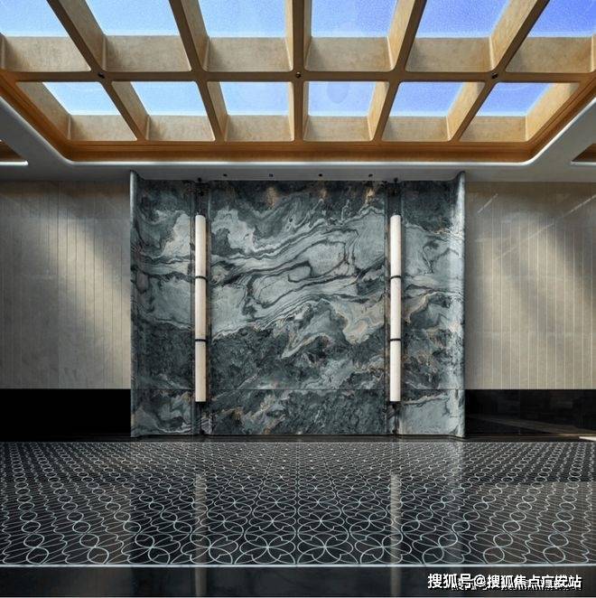 进入入户大堂后,映入眼帘的就是“万象山河”的奢石背景墙,独一无二的纹理,如此的大尺度,第一眼就够震撼,听说单这块石材就花了好几十万,绝对的大手笔。大堂内还配置了社区管家,刚进门就有贴心服务,尊贵感拉满。