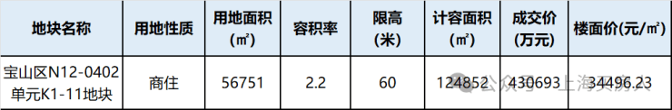 宝山区N12-0402单元K1-11地块,由金茂&招商(金茂70%,招商30%)于2024年12月30日八批次土拍中以总价43.07亿竞得,楼面价34496元/㎡,溢价率16.03%。