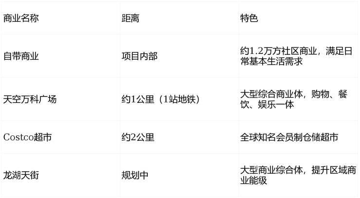 🛍️全维商业配套:2公里范围内汇聚天空万科广场、Costco超市、龙湖天街(规划中)等知名商业体,步行可达大型商业综合体,满足购物、餐饮、娱乐需求。