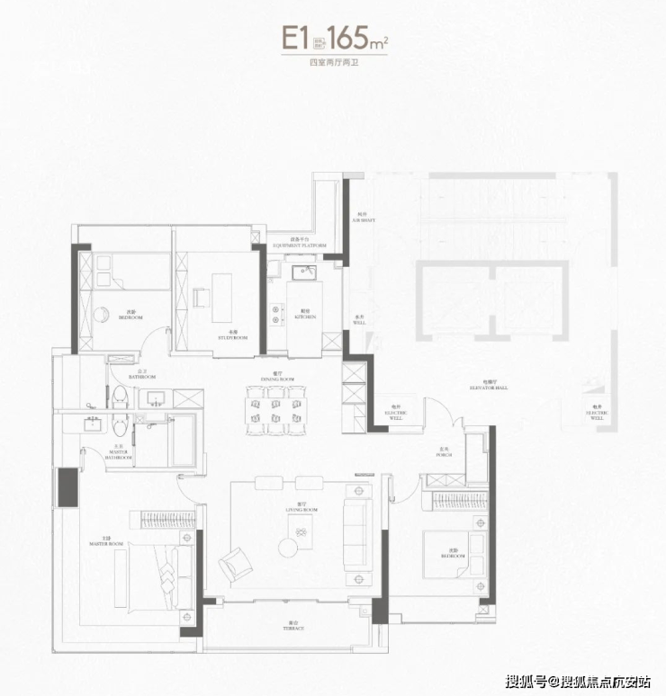 165㎡ 四房三卫:1080 万起,5.4 米大方厅、全景阳台