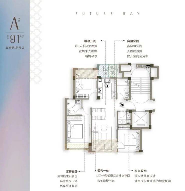 建面约91方真三房户型,真南北通透洋房产品北侧无消防连廊设计,小面积也是真南北通透,区别市面2+ 1户型,最小的卧室也有将近9个平方,每个卧室面宽均达到3米及以上全能收纳王入户标配储藏间,同时三个卧室均预留了衣柜区。108方户型布局差不多,但北面多一个房间。