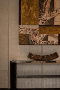 整个公区引入沉香米黄、透光云石、安哥拉黑、福鼎黑、橙皮红、宝格丽紫等近二十种全球奢石,宛如一座流动的奢石博物馆。