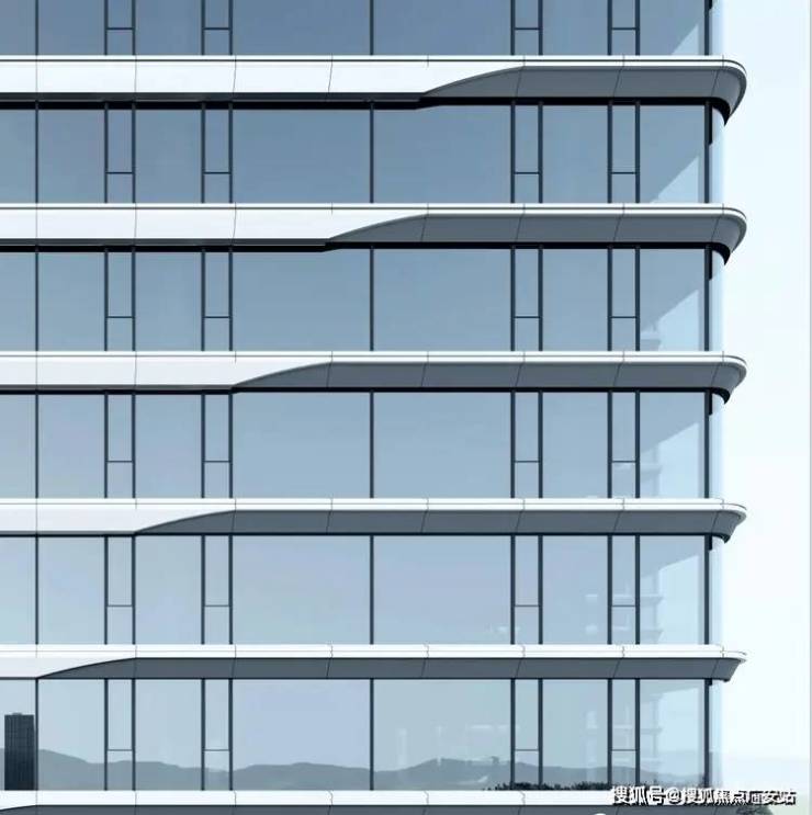 远观:初露真容的立面以大面超白玻璃和铝板线条组合,采用横向流畅的设计,切割成不规则的六边形,转角处又别出心裁的打造了圆弧玻璃幕墙,以柔和的角度将最大景观面装进视野范围。