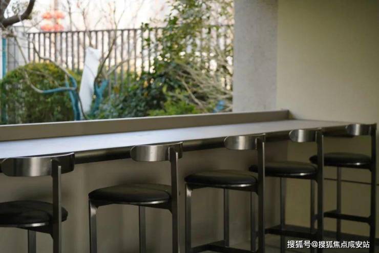 沙发靠背材质不锈钢冲孔网,透气性强,即使夏日炎炎,也带给人舒适凉爽,线条简洁的铝合金桌搭配柚木台面,黑色高脚凳在简洁色彩映衬下,尽显都市时尚气息。空间中色彩与质感的交融,实用与美观兼具,营造温馨舒适的交流空间。