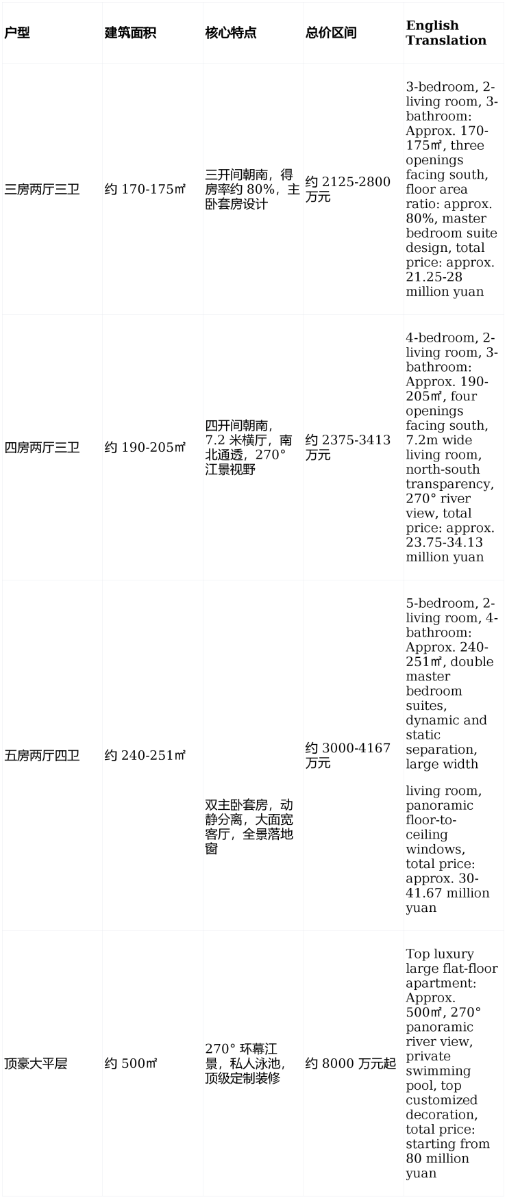 主力户型:190-252㎡(3-5房),层高3.35米,得房率79%.