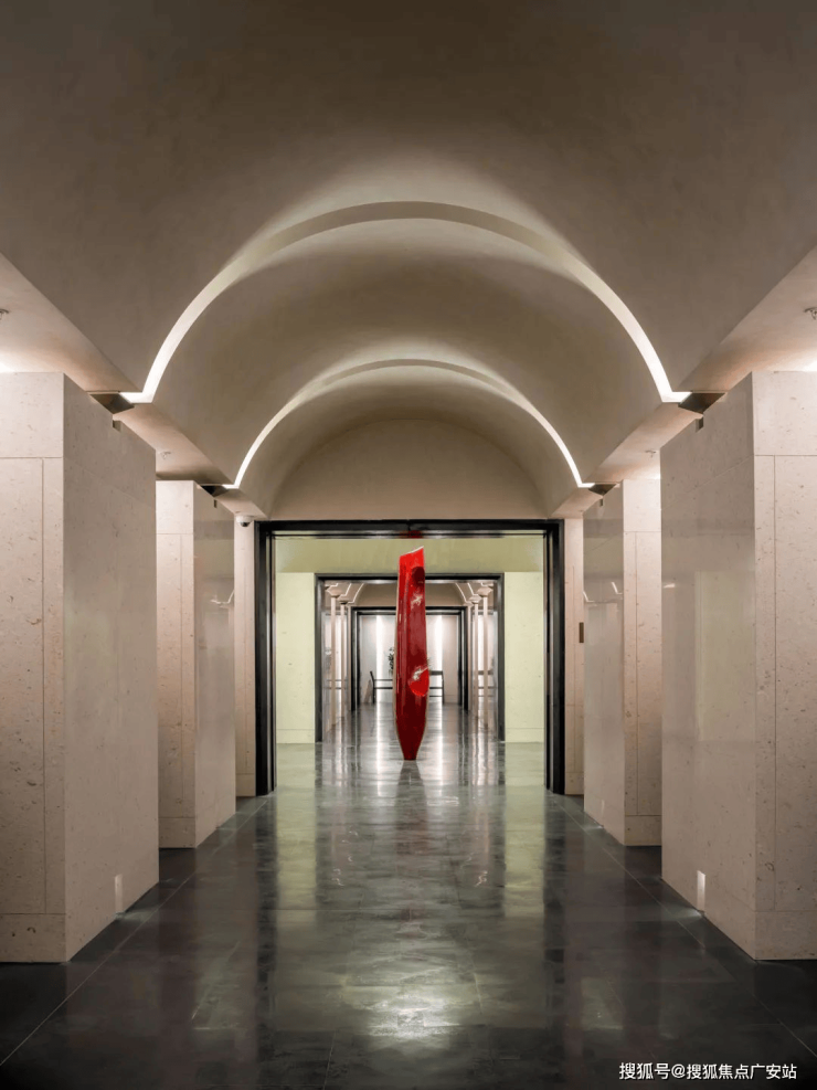 在二楼的接待大厅中,一尊红色的雕塑矗立而起,其顶端延伸至三层楼高。大厅内会定期更换展品,充满了浓厚的艺术氛围。