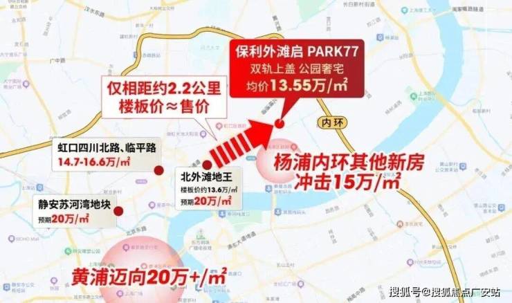虹口四川北路-临平路14.78-16.6万/㎡,北外滩绿城地王楼板价达约13.6万/㎡,这一楼板价,几乎与保利外滩启PARK77均价(13.55万/㎡)持平,未来该地块也将剑指20万/㎡。