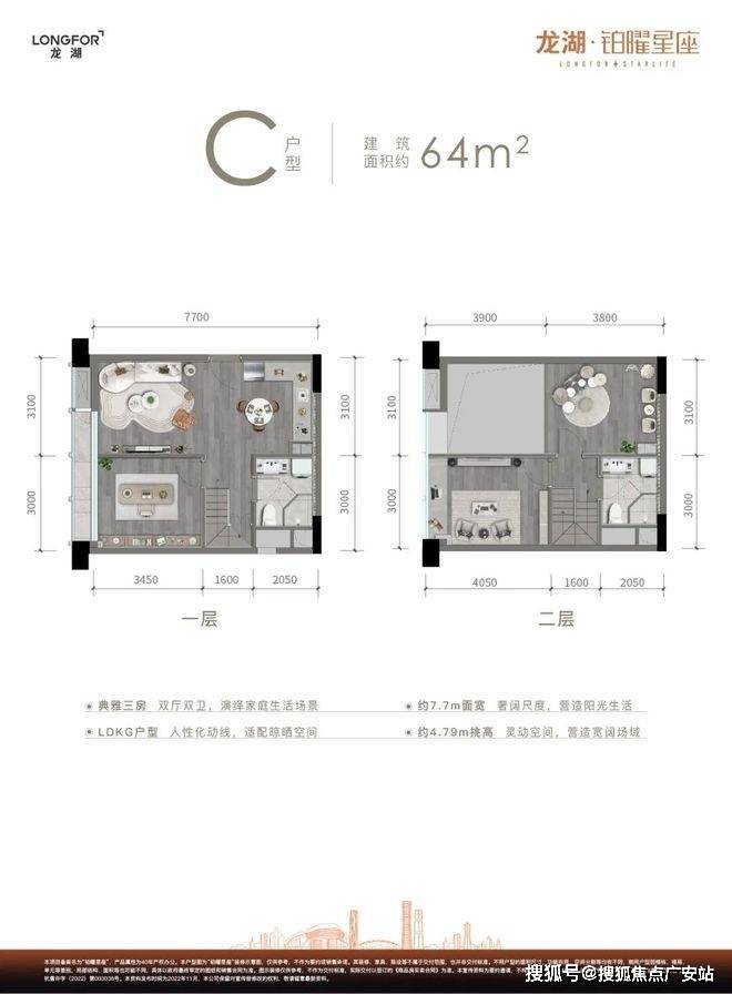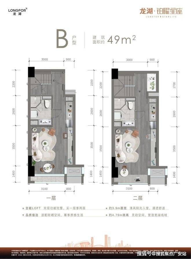 主力户型42㎡、49㎡、64㎡双钥匙LOFT,层高4.79米,得房率超120%