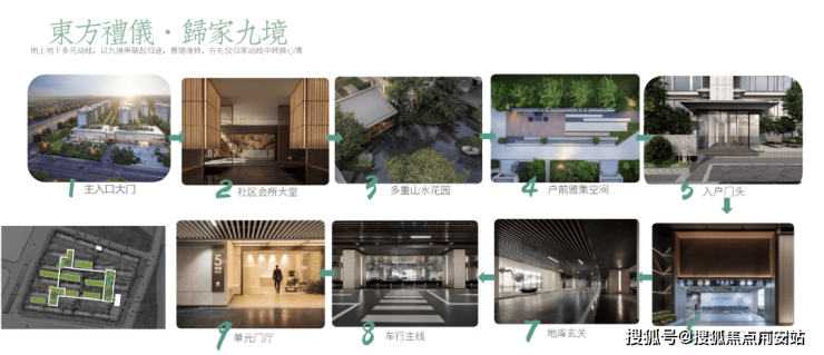 九重归家动线:社区入口双层酒店式形象门楼——(地上归家)社区会所大堂、多重山水花园、楼前雅集空间、单元大堂 ——(地下归家)地库出入口、地库玄关、车行主线、地下层单元大堂