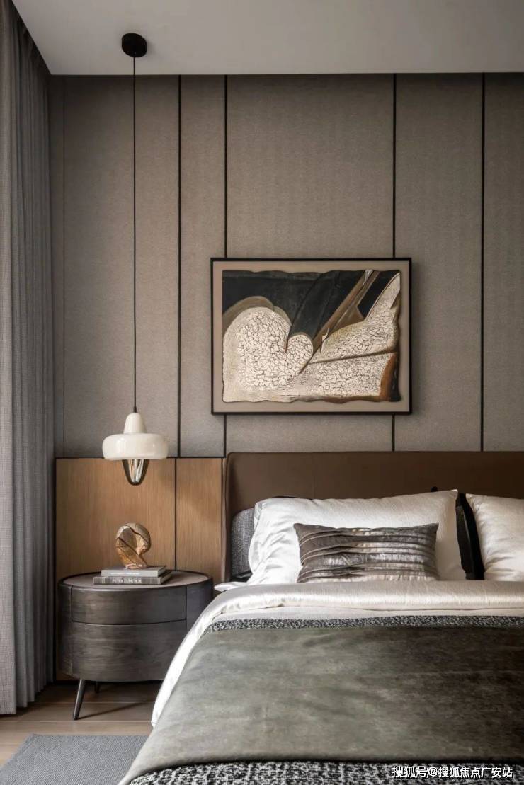次卧的色调相对更为深邃,设计师通过不同的色彩选择,为静谧的氛围赋予了别样的诠释。有的空间明亮温暖,有的则内敛深沉,各种高品质材料相互搭配,编织出柔软而舒适的触感,再辅以恰到好处的艺术装饰,将空间的高级感提升到新的高度。