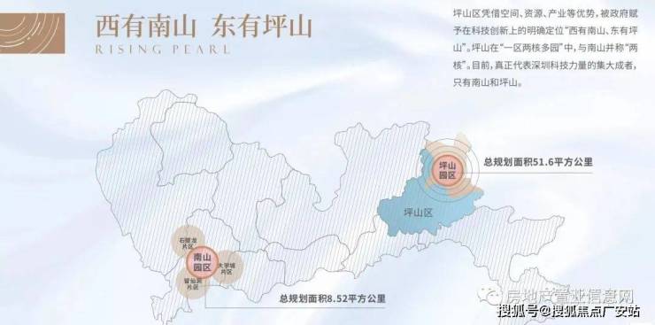 西有南山 东有坪山 执掌未来发展,深圳以“10+1”区政策领衔湾区建设,东进战略1.4万亿投资总额,坪山区获逾6000亿元资金扶持,形成西有南山、东有坪山发展格局,坪山高新园区总面积约51.6平方公里,约为南山园区6倍,远见未来想象。