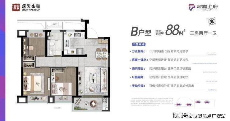 主力88-99㎡三房户型(全明设计,南北通透)。5