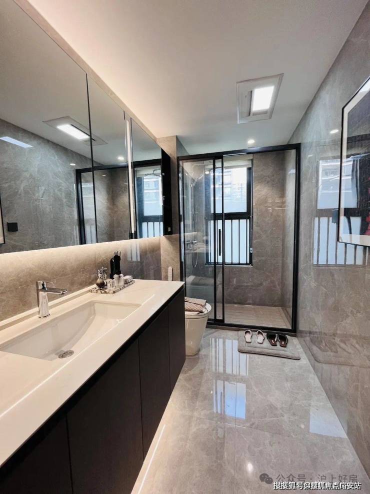 所以虽然是约89㎡的紧凑型3房,但这个户型还是有空间做了一个1.5卫的设计,保证了主人的私密空间,也避免了早高峰用厕的尴尬。样板房实景照片如下: