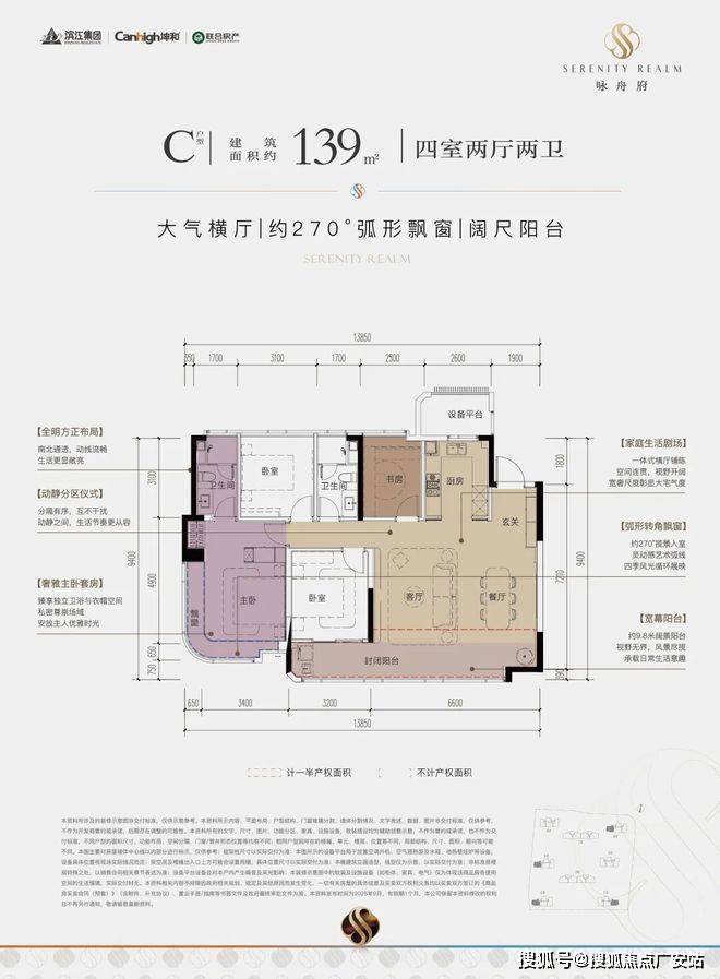 一款是四开间朝南的横厅户型,南向约13.85米的极致采光面,阳台也有约9.8米;动静分区,私密感超强;主卧套房带L型弧形转角飘窗,居住体感堪比全景舱。