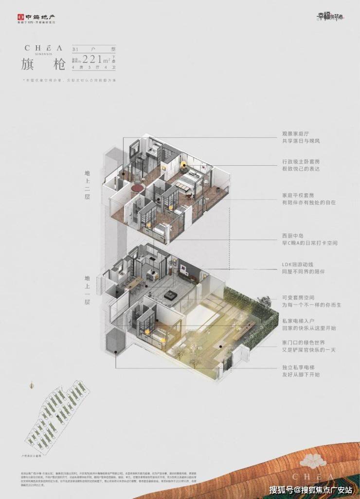 建面约221方的下叠户型-旗枪,首层大厅与多功能居家空间、玄关、北向景观小品相连,更进一步拓展了单层面积的空间尺度感与视觉可达性,借此获得“全面空间、移步换景”的舒居体验。