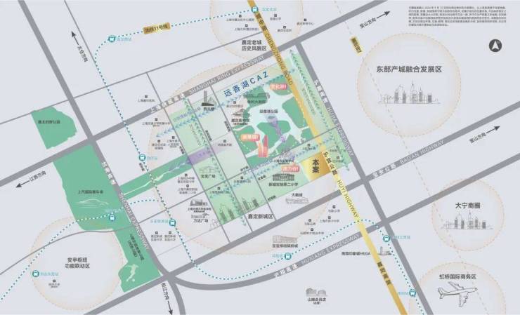 一条沪宜公路,贯连嘉定南北,通过这条大动脉往南能迅速接驳沪嘉高速、嘉闵高架,通达大宁、虹桥、真如等城市CBD。往北则链接远香湖CAZ,聚集嘉定新城的城市资源精粹。