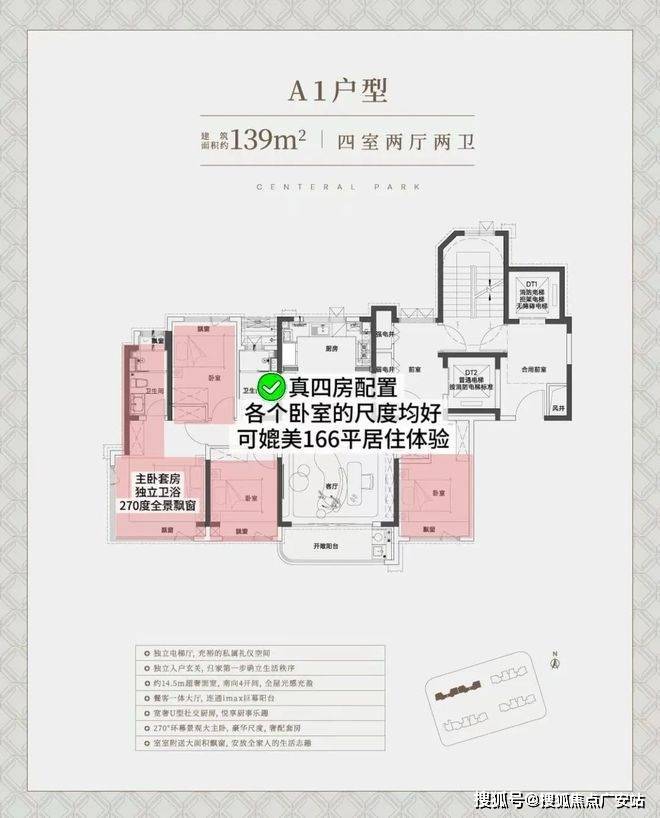 中环铂樾建面约139㎡的户型(西边套),独立电梯厅+罕见的大横厅设计,大面宽短进深,约15.05m的南向奢阔面宽,无论是采光感、尺度性都拉到了极致,享受城央豪宅级别的采光。