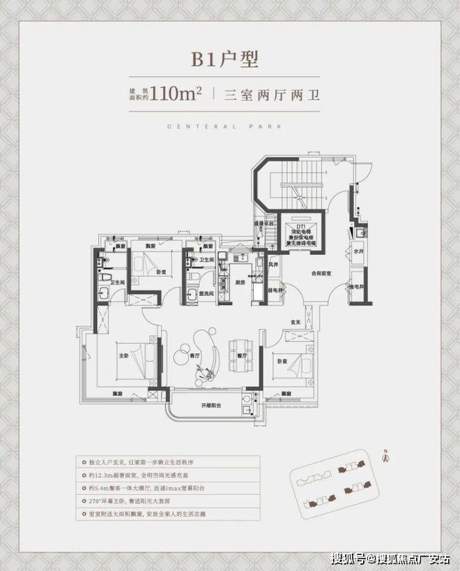 建面约110㎡三房边套户型,约5.4m超大横厅、南向面宽做到了惊人的约12.3米,堪比别墅级别的产品!巨幕阳台+边套270°景观视野,空间体验与采光感拉满!