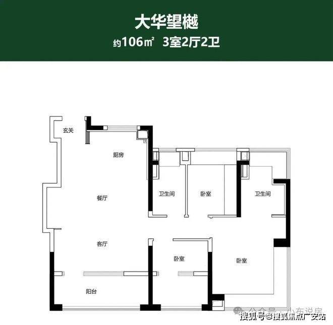 106㎡户型:三房两厅两卫,3.5开间朝南,南向面宽约11.8m