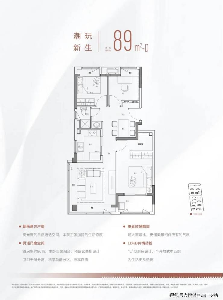 建面89㎡三房两卫:双开间约5.5米超大阳台、全屋飘窗、LDKB一体化设计(客餐厨阳台连通),支持灵活改造为健身/儿童空间。