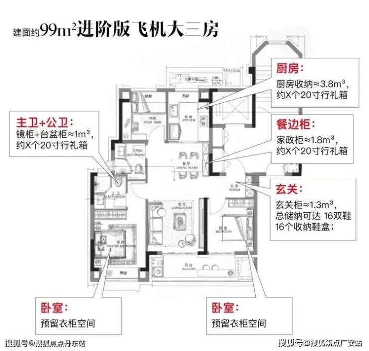 主力建面约99㎡3房产品,非常标准的南北通透飞机户型,整个室内几乎无走道,空间0浪费。