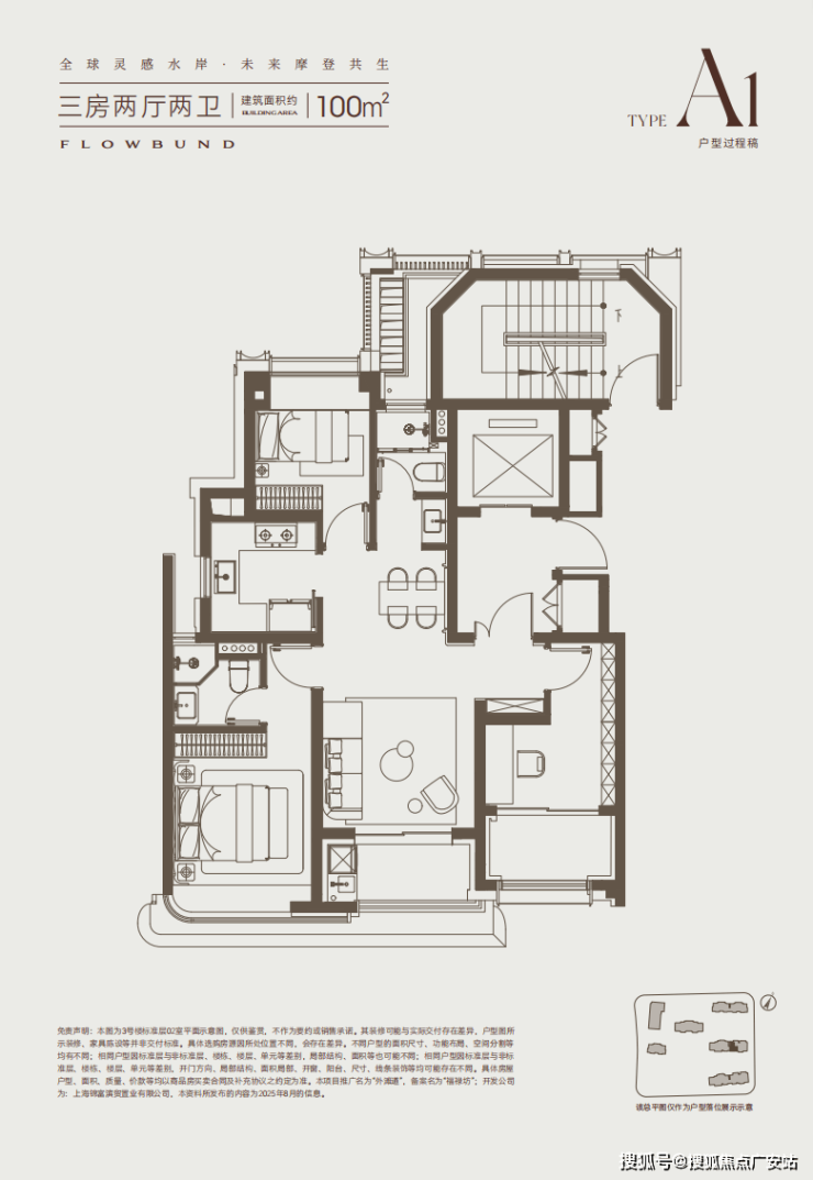 户型采用“十字序列厅”布局,南向双套房均配备独立卫浴,主卧预留衣帽间空间,三代同堂家庭居住也能互不干扰。