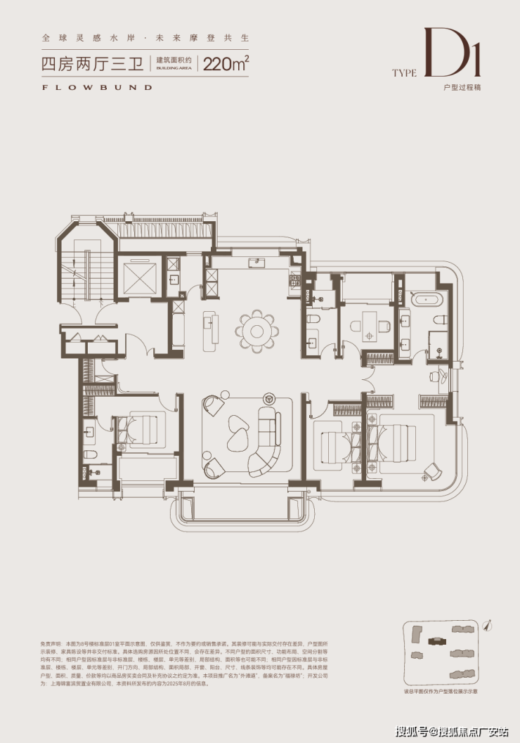 位于5号楼楼王位置的约220㎡四居是顶豪家庭的终极之选。270°景观舱式设计,结合超大面宽阳台,形成了连续四个开间的奢华南向景观面。
