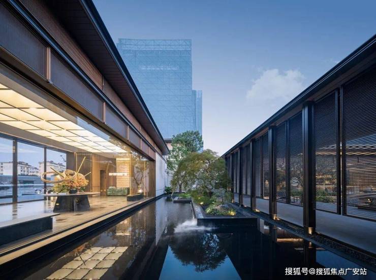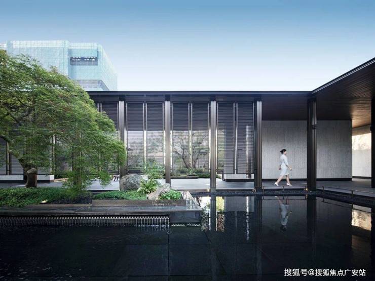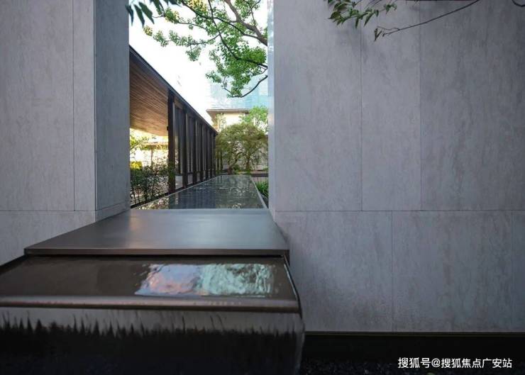 穿过门堂就是长20米宽6米的琉璃光院,设计师以琉璃为灵感,在运用光线、镜面水、简约的植物池和跌水等景观元素的基础上,巧妙地勾勒出一幅绝美的画卷,宛如时空之门,每一处空间均兼具实用与美感,这种一体化的空间设计,源自对生活的憧憬:使建筑场所诗意化、奢意化和场景化。