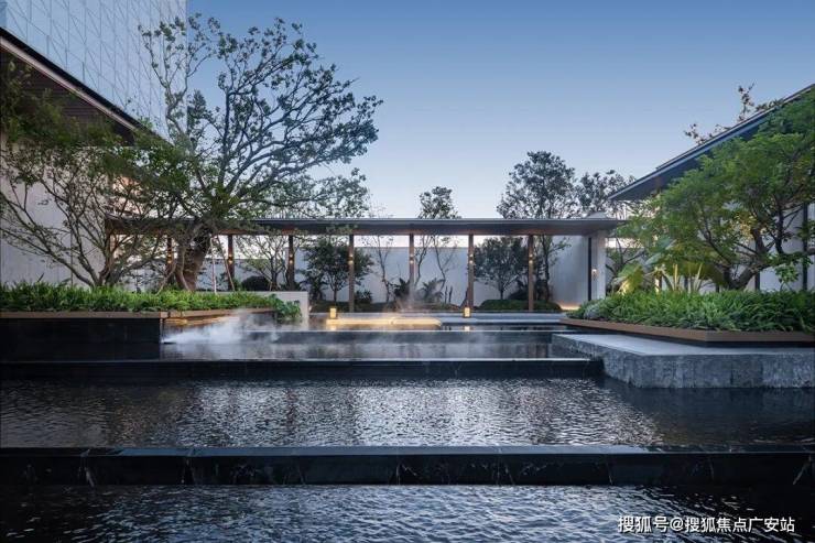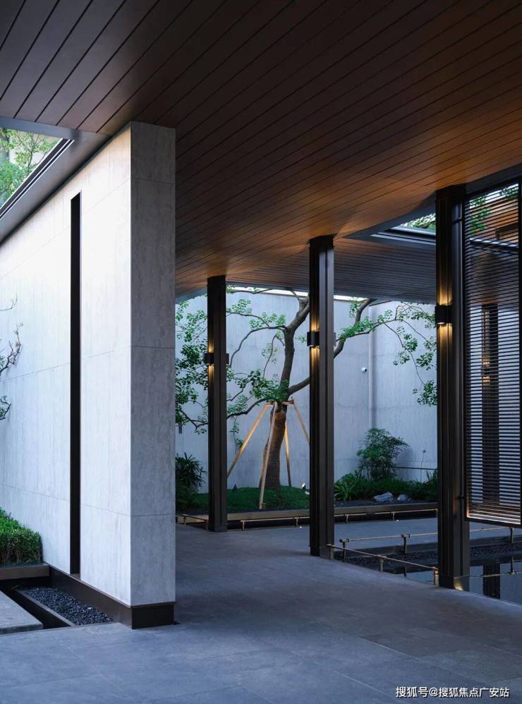 一池一松石,强调归家的仪式感,精致的景墙舒适延展,两侧的水景与特色种植的嘉木相辅相成,竖向的线条划分出视觉的秩序感,黑色水景顶部的镜光水面如同一块黑色砚台,灵动的清泉搭配两边维纳灰石材的景墙,金属瓦檐加青绿色金属压顶的搭配,提高奢华感,多了份东方尊贵开阔之气。
