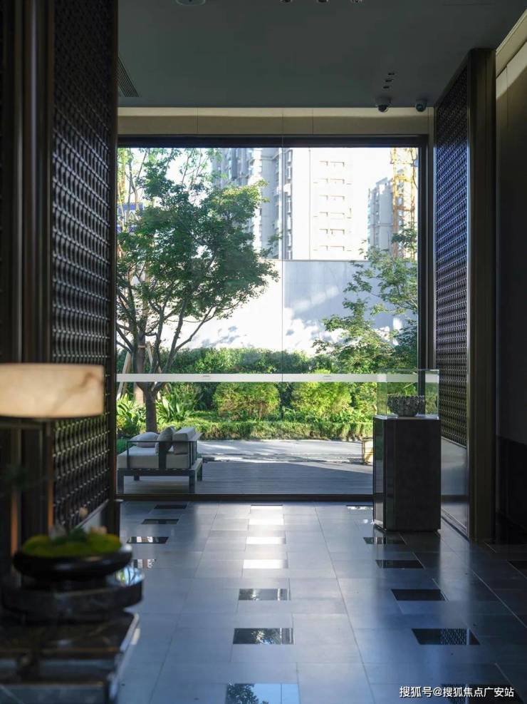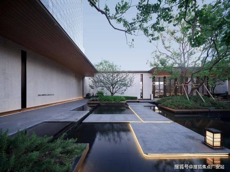 琉璃光院作为第三重归家礼序,光线穿透超薄镜面水面,便迸发出晶莹剔透的琉璃光辉。碧绿的树影映照在水面上,营造出一种清幽空灵的视觉美感,仿佛将归家的业主从喧嚣的外界引向内部宁静的私人领域,完美地体现出现代人对返璞归真的追求,放下那份喧嚣与风尘,让潺潺水声洗涤心底那份疲惫,回归铜墙铁壁外的桃花源。