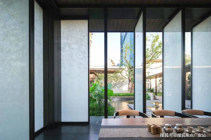 虚的庭院,被实的建筑环抱。园中临水轩堂,环绕于绿树和水景之间,恰似水墨画中的留白,邀请人们驻足其间,感受风的轻抚,聆听鸟的歌唱,体验宁静与恬淡。