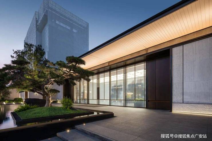 建筑门堂主体高宽比1:5-1:6,建筑与景墙横向延伸,在入口的两侧创造了可视化的归家路径,精致水景与景墙构建出一幅绵延的城市画卷,彰显出江南昆山独有的东方诗意风情,体现了其奢华和精致的材质细节,而这美轮美奂的设计犹如流动的江南水墨,充满细腻和深邃,完美地展示出昆山的典雅和精致之美。
