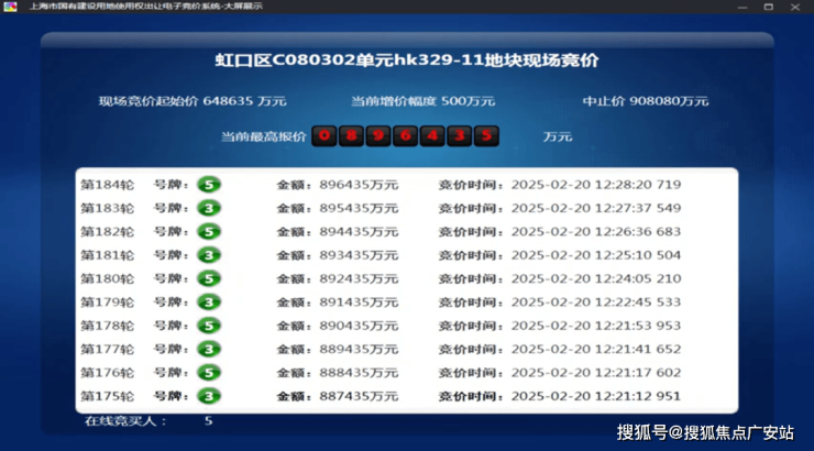2025年2月,今年第一批次土拍中,经过184轮竞价,金茂&庆隆联合体以总价896435万元竞得虹口C080302单元hk329-11地块,溢价率38.2%,折合楼板价117474元/㎡,装修标准不小于4000元/㎡。