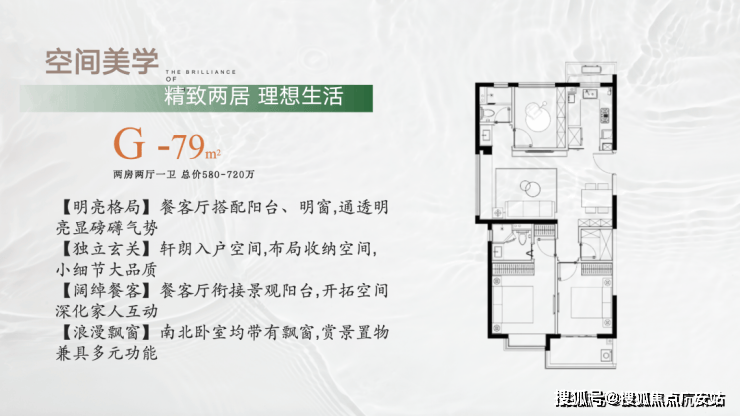 项目主推建面约79-99㎡的精装2-3房,总价580万起,均价约8.7万元/㎡,预计2026年12月31日交付,为70年产权住宅,精装交付标准包含中央空调、地暖、新风系统等一线品牌配置 。