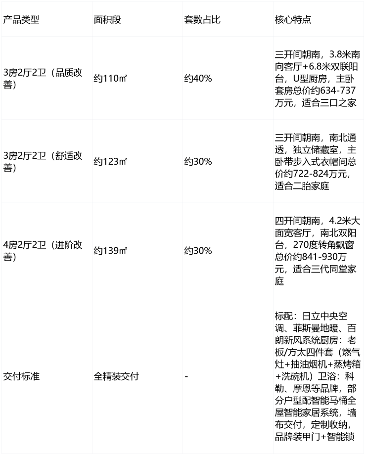 主力户型:建面约110-139㎡3-4房,得房率约78-80%,全精装交付(中央空调+地暖+新风系统三大件),精装标准约4500元/㎡