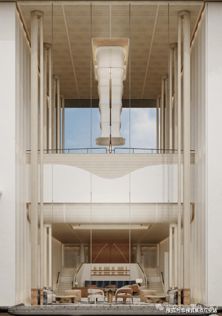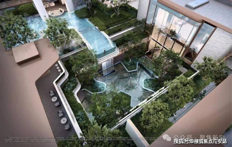 项目配建地上架空层泛会所+地下会所,以及下沉式庭院会所,打破人与空间边界的架空场域。会所设计整体空间祛除浮华矫饰,始终让景观以人为核心展开,整体景观规划以悬挑水池将⽔引⼊下沉⾃然⽔院,利⽤⽔幕链接,打造多层次景观,宛如⼀幅变幻的⽴体流动画作。会所区域配置风⾬连廊,以⽔景、绿篱、休憩平台串联,移步异景。