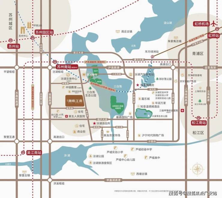 距离高铁苏州南站直线距离约3km,沪苏湖高铁向东经过松江南站直达虹桥枢纽