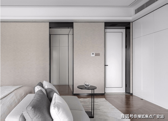 主卧的空间相对较大,背景是利用左侧的窗帘做的对称硬包的处理,其实后面有暗藏的灯带,使层次更为丰富一些,整体的家私和风格的感觉延续客厅,注重品质和空间的感受。