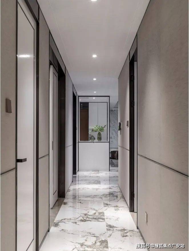 透过鞋柜看向过道,门全部做了到顶的处理,中间的腰线在公共开放区域是整体贯穿的元素,并结合柜门的开启高度,硬包的中线高度等等做了一个整体的联系。