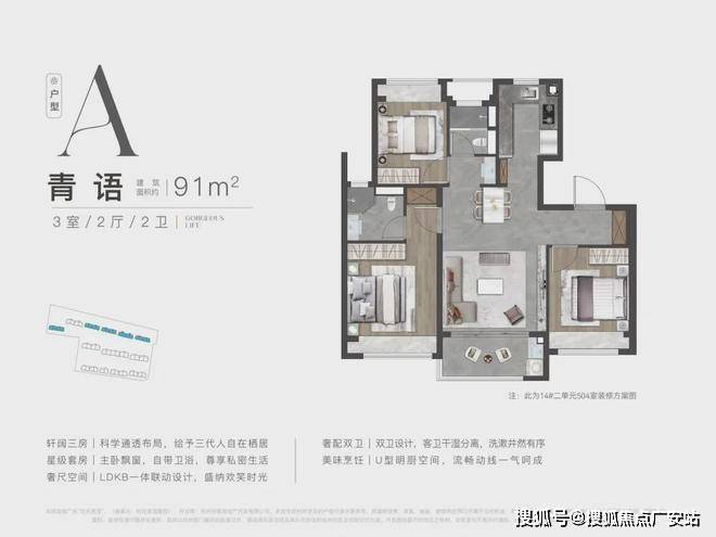 91㎡户型采用LDKB一体化布局,128㎡含南向双联阳台