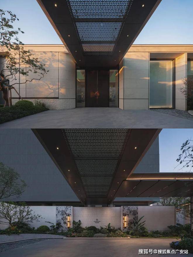 建筑立面选用米白与暖灰的现代轻奢色系,铝板线条+涂料一体板组合使用,简约线条设计,彰显现代典雅美学风格。