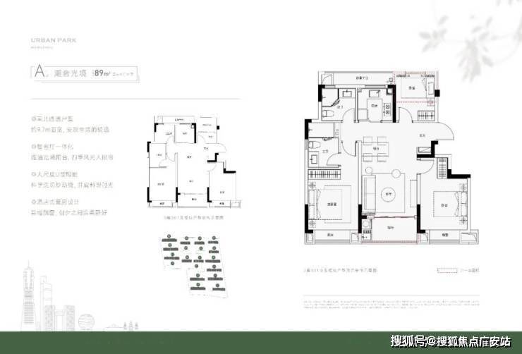 杭颂星澜府在户型的设计上更加游刃有余,主力的89方户型设计成了类四叶草的布局:动线合理、减少走廊的浪费、各卧室独立且私密。同时三开间朝南的设计,面宽达到了9.7米,主次卧均带有飘窗,采光充足,而且主卧为套房的布置,让生活更舒适。