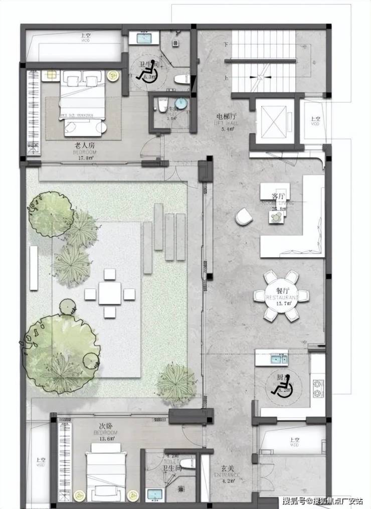 设计师以三面建筑和一面围墙,四合成内聚型的景观空间,庭院居于其中,成为建筑各房间的视线焦点。每户均有80至100平方米的开放式内庭院,宅在院中,宅院合一,天地共生,天人合一。每户地下层面均有3处花园式采光天井,保证了地下空间的舒适通透。