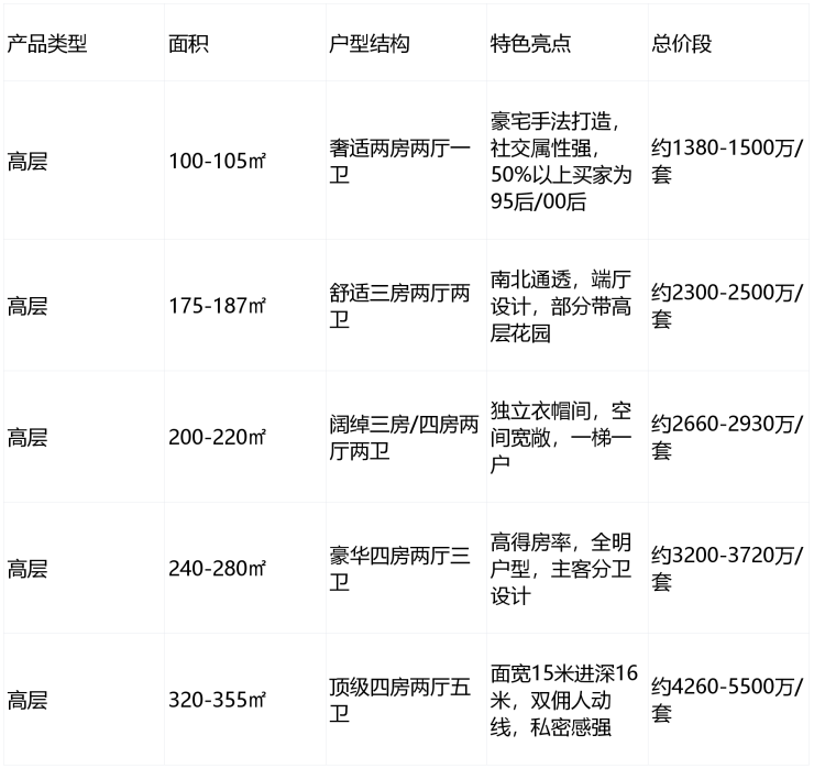 主力总价段:1380-5500万/套,覆盖高端改善到塔尖人群需求